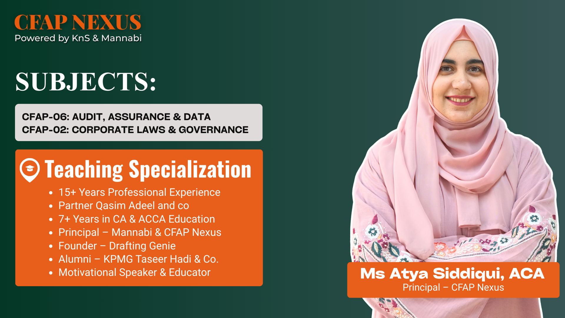 Ms. Atya Siddiqui is an excellent teacher. I studied CAF Audit under her guidance and found her teaching style extremely clear and engaging. I’m excited to continue my CFAP journey with her and gain the same level of clarity and support.